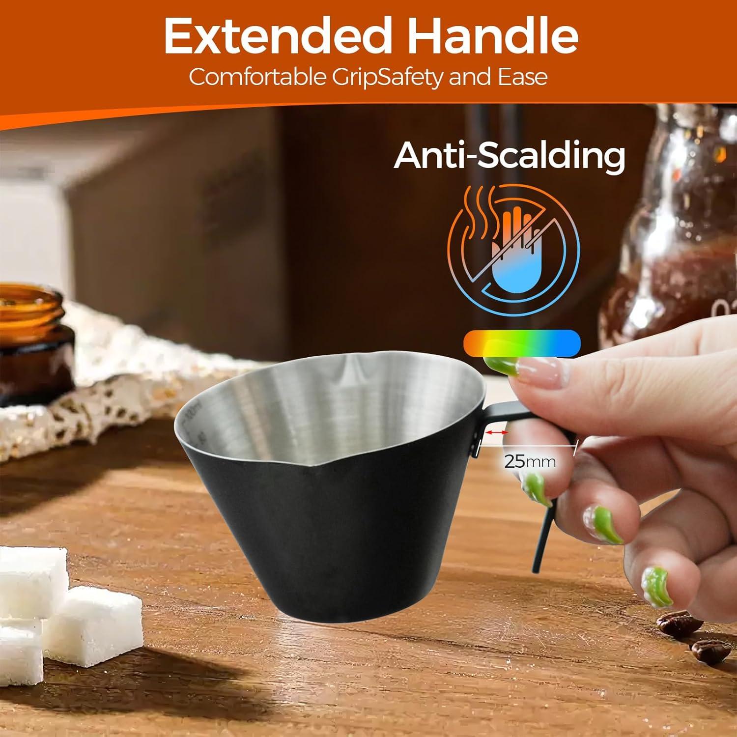 Ergonomic Handle for Easy Grip & Anti-Scalding:The stainless steel measuring cup has an ergonomic handle for a secure,comfortable grip.It’s safe for hot espresso or freshly whipped milk,ensuring your hands won’t get burned while you enjoy your coffee