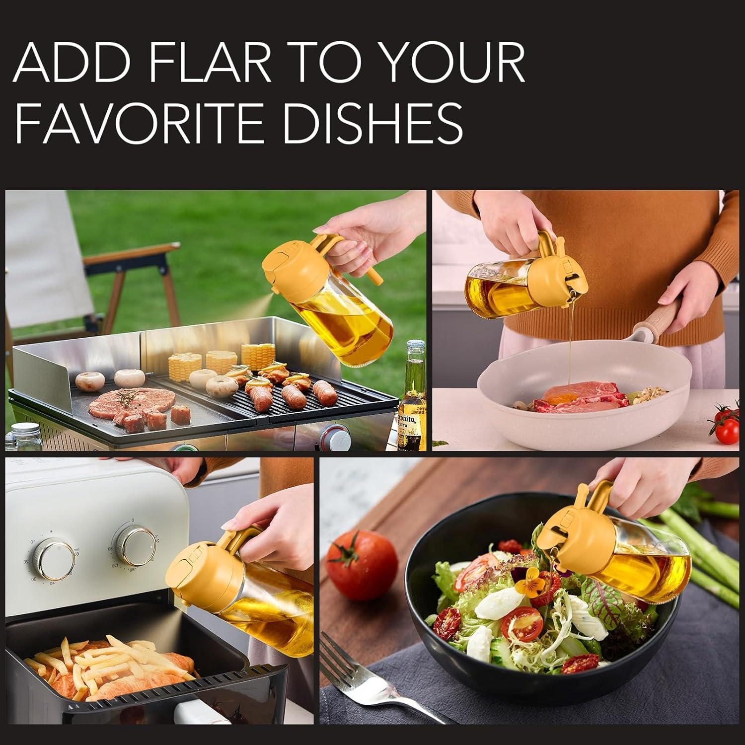 Dual-Function Design & Multi-Purpose: Oil spray bottle for cooking offers the convenience of both spraying and pouring oil, suitable for a wide range of food preparation processes such as salad dressing, griddle, roasting, grilling