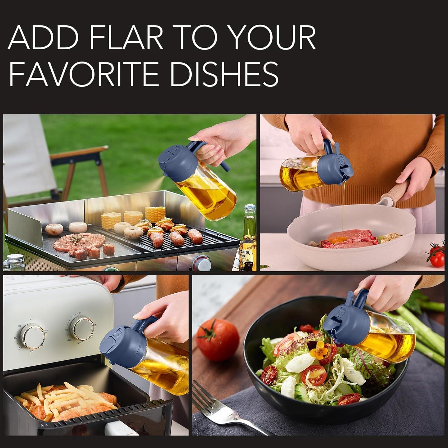 Dual-Function Design & Multi-Purpose: Oil spray bottle for cooking offers the convenience of both spraying and pouring oil, suitable for a wide range of food preparation processes such as salad dressing, griddle, roasting, grilling