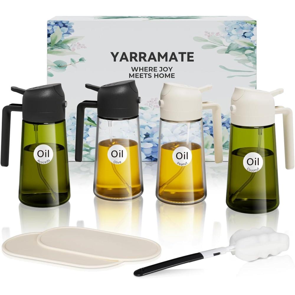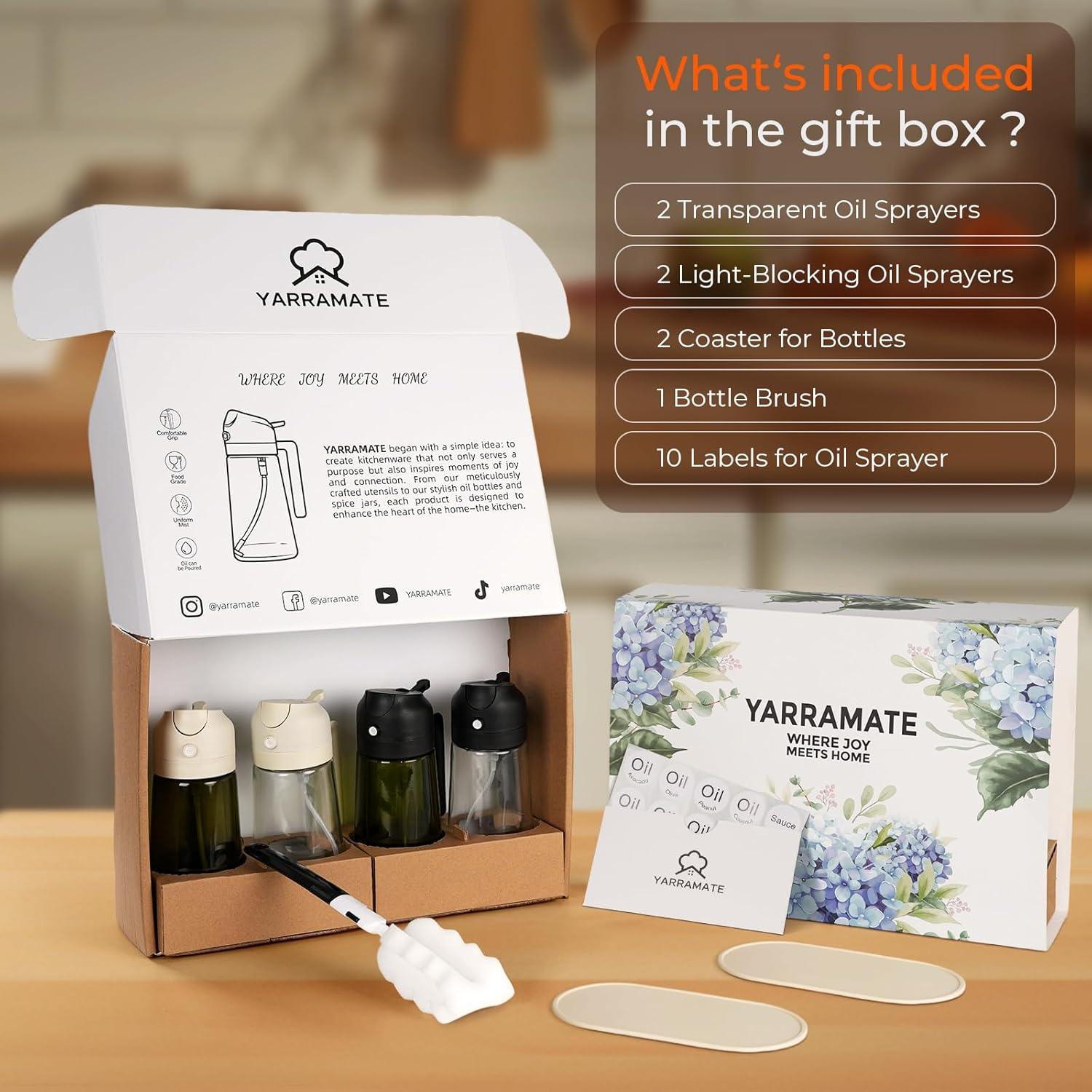 YARRAMATE Olive Oil Dispenser, 2 in 1 Oil Sprayer for Cooking, 16oz/470ml Glass Oil Spray Bottle with Pourer, Food-grade Oil Dispenser and Oil Sprayer for Kitchen, Salad, Frying, BBQ (Black & Green)(20_4Pcs Gift Set)