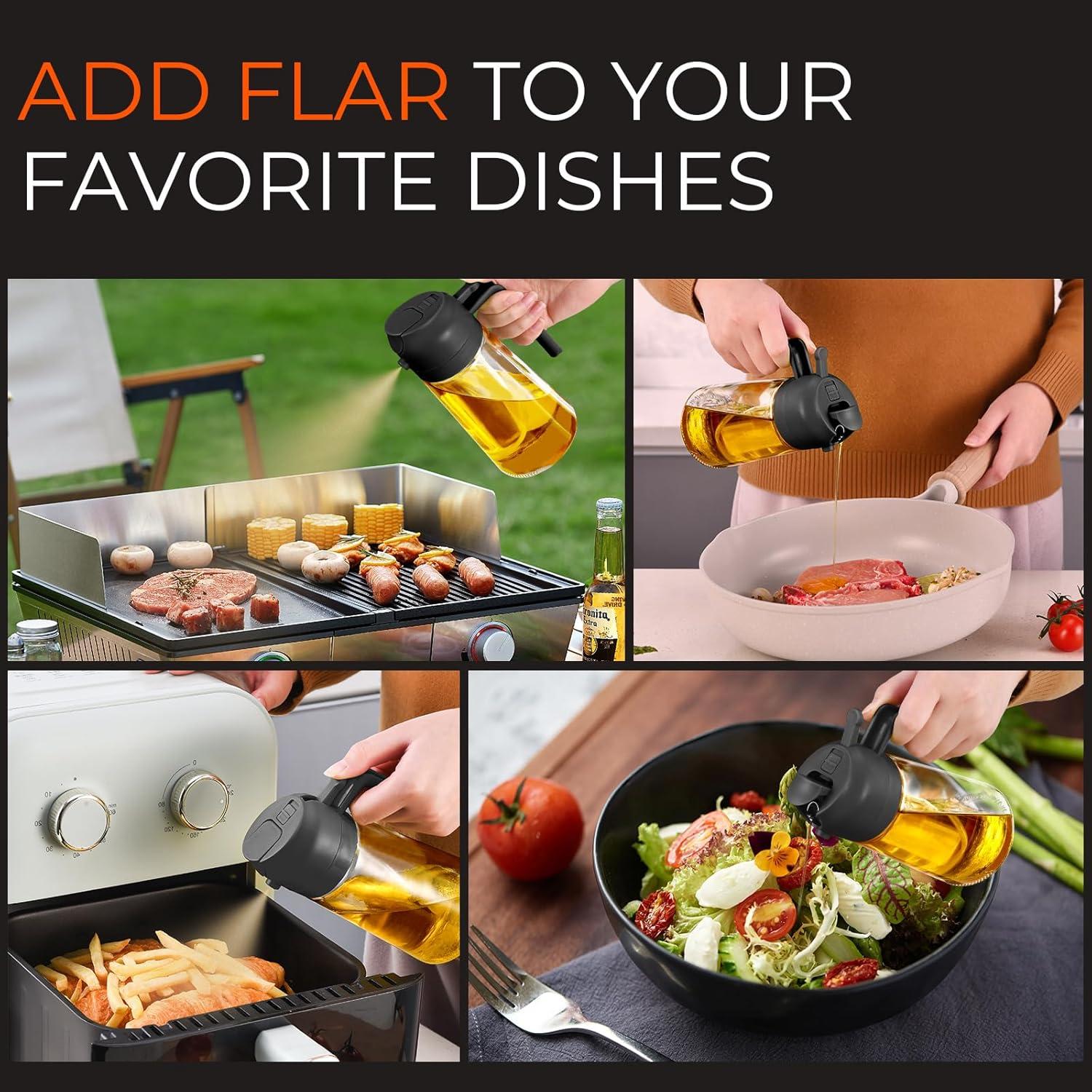 Dual-Function Design & Multi-Purpose: Oil spray bottle for cooking offers the convenience of both spraying and pouring oil, suitable for a wide range of food preparation processes such as salad dressing, griddle, roasting, grilling